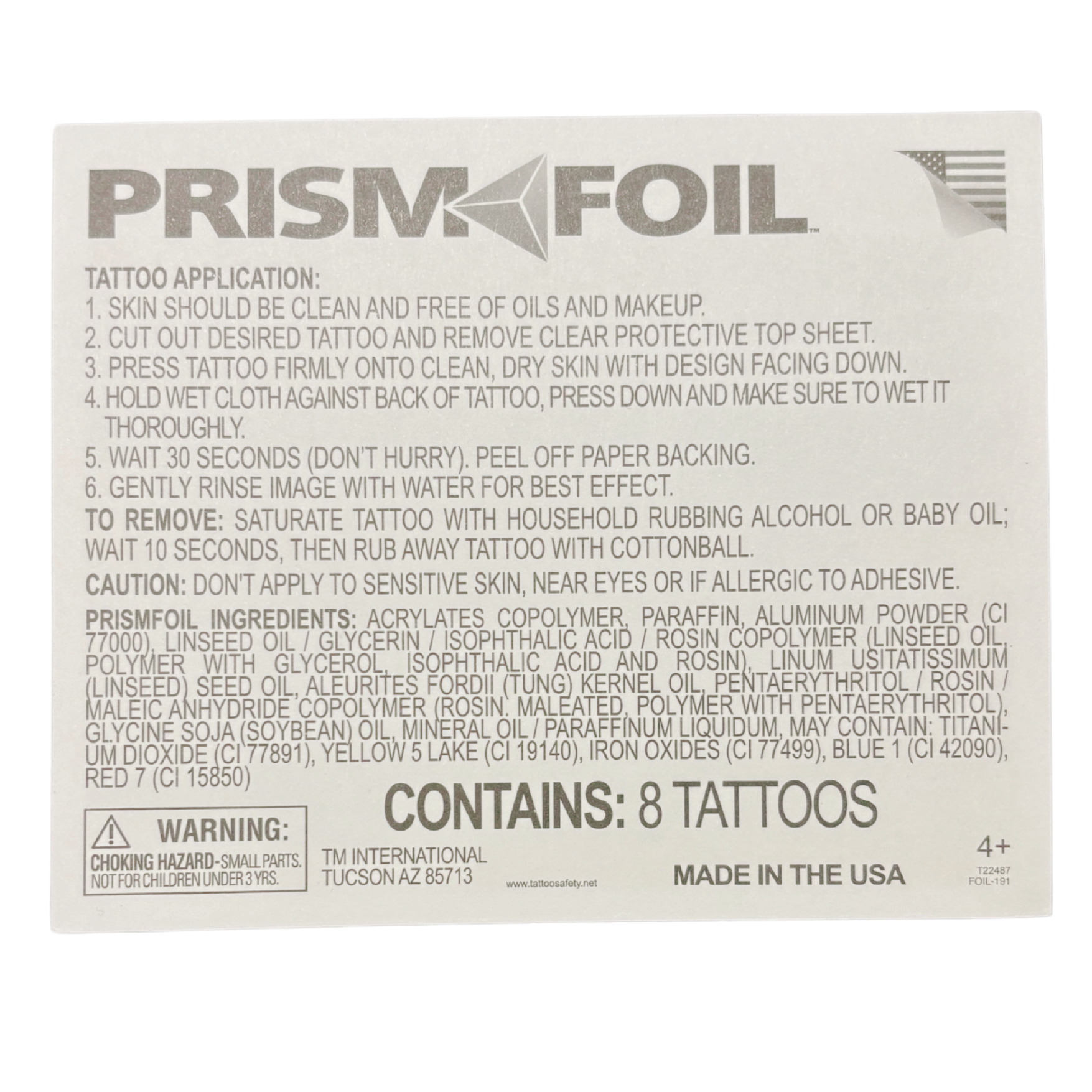 To use, cut apart tattoos. Remove the clear topsheet, press to skin, and hold a wet washcloth over the paper backing until the paper backing freely peels off, leaving you with an adorable temporary tattoo. Lasts 3-5 days. Remove with rubbing alcohol or baby oil.