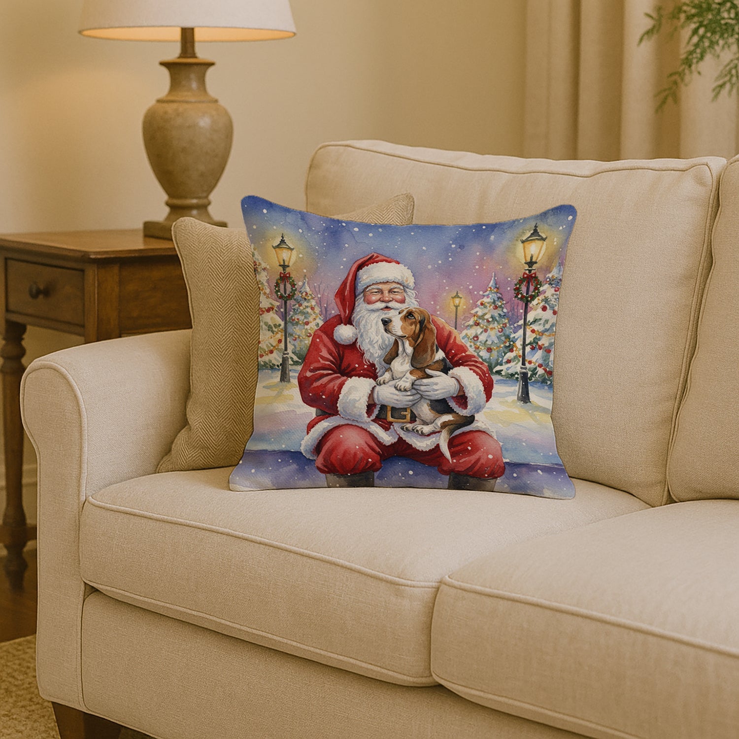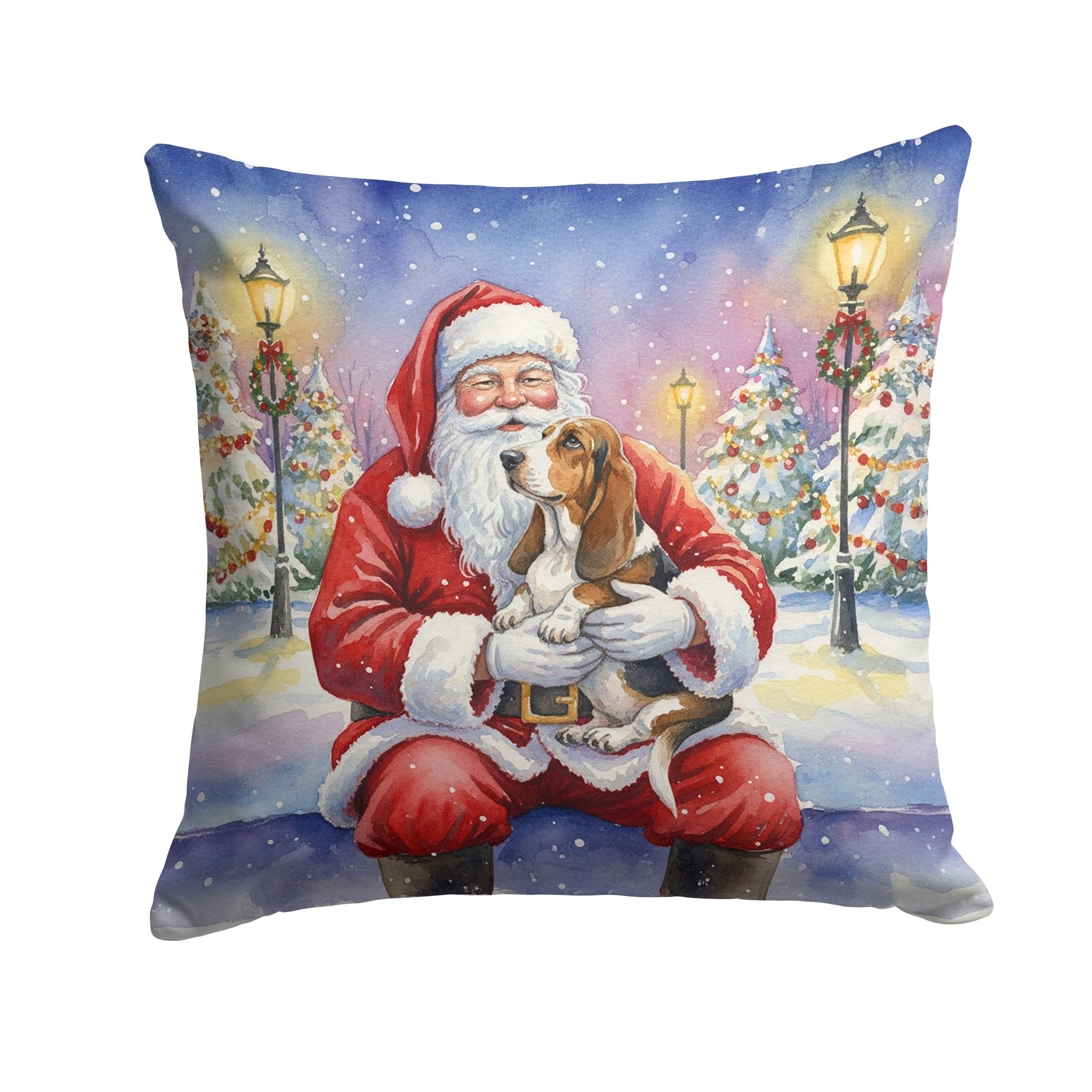 Throw Pillow featuring breed specific Basset Hound artwork. Celebrate Christmas with this Christmas Pillow. Add a touch of vibrancy and comfort to your outdoor seating with Caroline's Treasures Fabric Decorative Pillow. Measuring approximately 14 inches by 14 inches, this outdoor pillow is crafted to elevate the appeal of your patio furniture, infusing it with vivid color and artistic flair. The pillow includes a 100% Polyester Fabric sham filled with a quality pillow form to provide superior comfort. Innovatively made from our brand new material, specifically woven for its water resistance, this pillow is designed for durability. The soft canvas fabric offers versatility in use, fit for your indoor couch or your outdoor patio, porch, or veranda. The fabric is dyed with colorfast dyes built for resilience against weather conditions, ensuring the pillow retains its beauty over time. Constructed by sewing three fabric pieces to create a sham, the polyester insert is then nestled inside to form the pillow, resulting in an overstuffed pillow that maintains its shape. Both the sham and the pillow insert are proudly made in the United States. As the pillows are handcrafted, there may be minor variations in size, further enhancing their unique charm. Experience comfort in style with Caroline's Treasures Fabric Decorative Pillow.