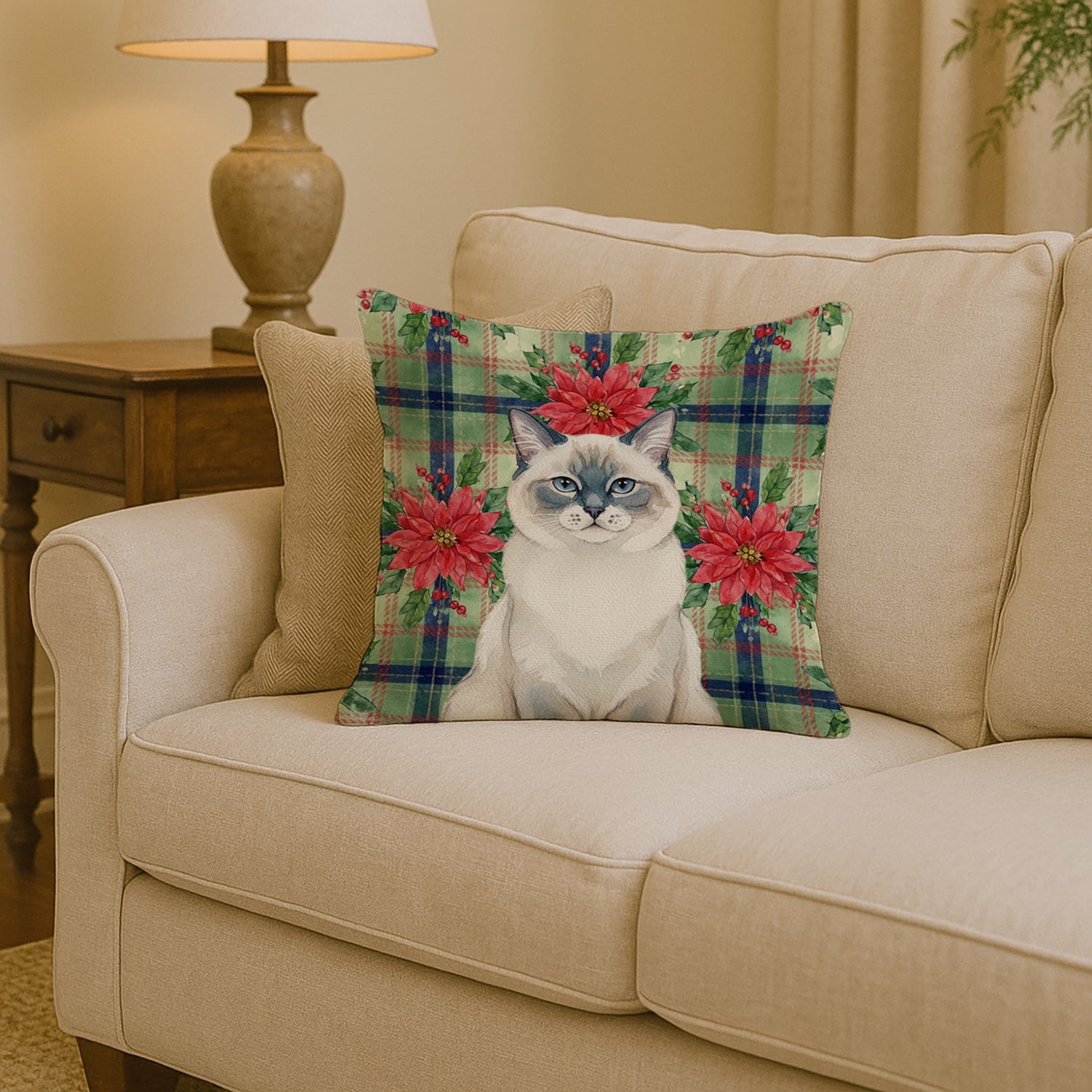 Throw Pillow featuring breed specific Ragdoll Blue Point artwork. Celebrate Christmas with this Christmas Pillow. Add a touch of vibrancy and comfort to your outdoor seating with Caroline's Treasures Fabric Decorative Pillow. Measuring approximately 14 inches by 14 inches, this outdoor pillow is crafted to elevate the appeal of your patio furniture, infusing it with vivid color and artistic flair. The pillow includes a 100% Polyester Fabric sham filled with a quality pillow form to provide superior comfort. Innovatively made from our brand new material, specifically woven for its water resistance, this pillow is designed for durability. The soft canvas fabric offers versatility in use, fit for your indoor couch or your outdoor patio, porch, or veranda. The fabric is dyed with colorfast dyes built for resilience against weather conditions, ensuring the pillow retains its beauty over time. Constructed by sewing three fabric pieces to create a sham, the polyester insert is then nestled inside to form the pillow, resulting in an overstuffed pillow that maintains its shape. Both the sham and the pillow insert are proudly made in the United States. As the pillows are handcrafted, there may be minor variations in size, further enhancing their unique charm. Experience comfort in style with Caroline's Treasures Fabric Decorative Pillow.