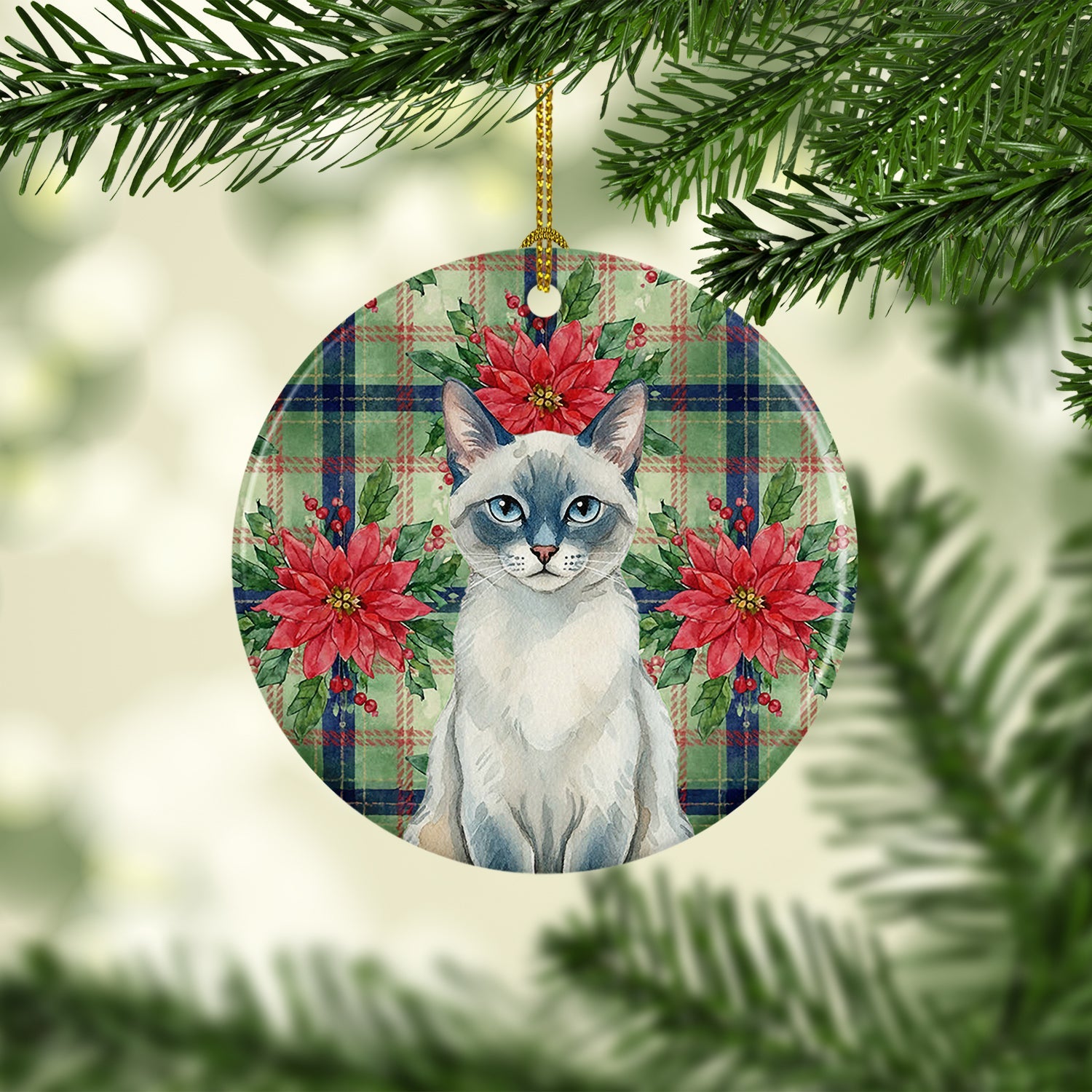 Ceramic Ornament featuring breed specific Blue Point artwork. Celebrate Christmas with this Christmas Ornament. Add a touch of personalized charm to your Christmas tree this holiday season with our Ceramic Ornament. Measuring 2.8125 inches in diameter, this round porcelain ornament beautifully reflects your festive lights, enhancing your holiday decor. The gloss surface sets off the vibrant, full-color artwork contributed by one of our talented artists, bringing a pop of color and joy to your tree. This Ceramic Ornament doesn't stop at being merely decorative. The white back is designed for personalization. Write a heartfelt message, mark a special year, or inscribe a date with a paint pen or a permanent marker to create a treasured memento. Please ensure you allow any personalization to dry thoroughly before handling to maintain the pristine finish. Included with the ornament is a delicate gold cord for easy hanging. Made in the USA, this Ceramic Ornament makes an exceptional gift for a pet sitter, teacher, family member, or anyone you wish to share a little Christmas magic with. With its blend of style, charm, and personal touch, it's a meaningful addition to any Christmas tree.