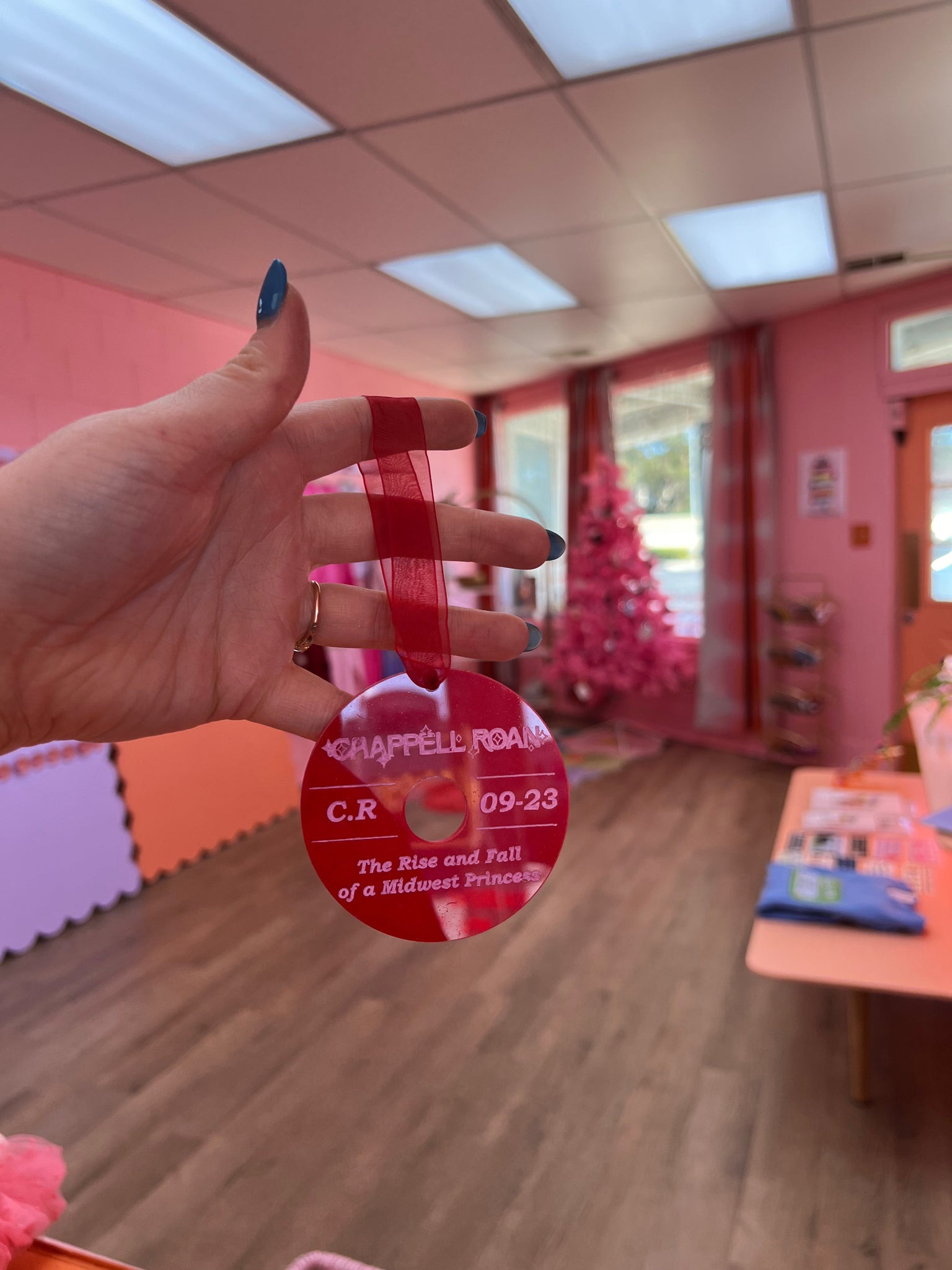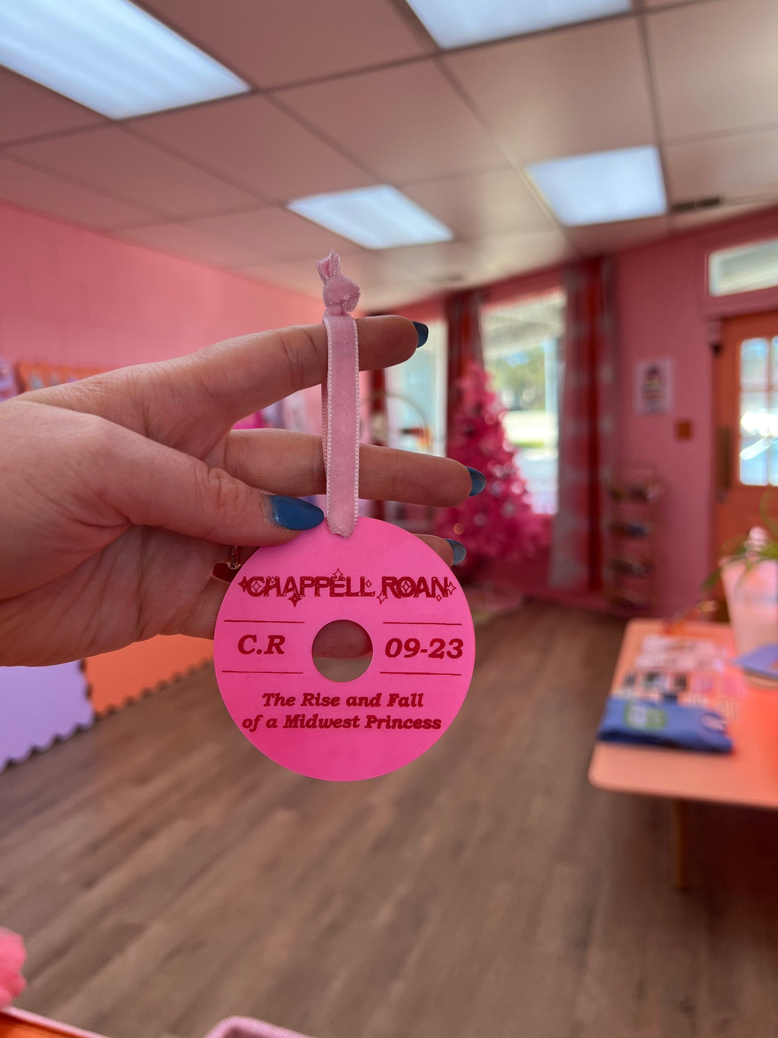 Experience the magic of Chappell Roan's album with our hand-painted ornament! Featuring the album title, name, initials, and release month, this 3" round ornament is perfect for any fan. Hang it on your tree or display it year-round to show your love for this talented artist.