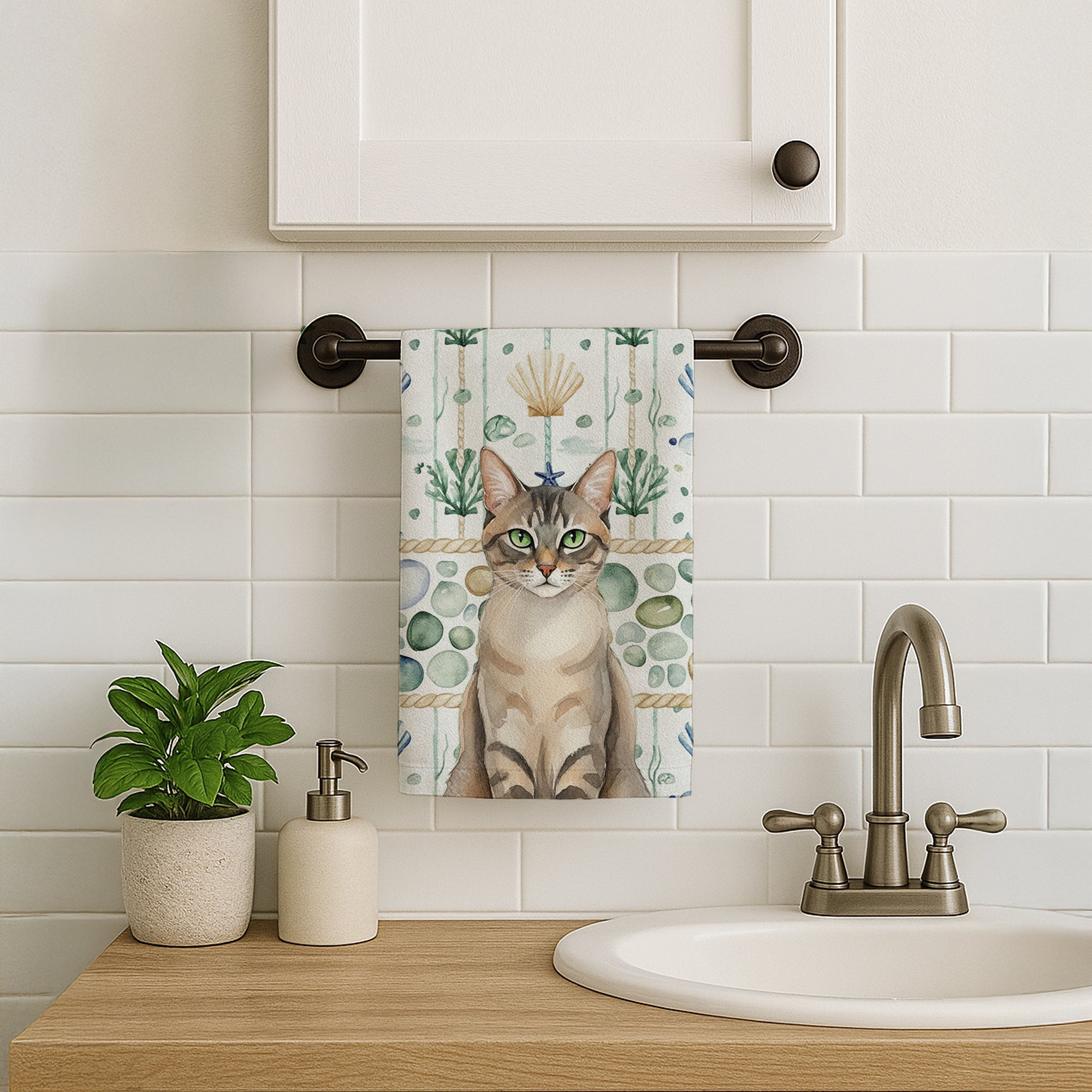 Kitchen Towel featuring breed specific Lynx Point Tabby artwork. Bring cozy everyday charm to your sink or powder room with a plush velour towel featuring original watercolor artwork. The front is a soft, color-rich minky polyester that polishes glassware to a brilliant shine; the back is 100% white cotton terry loop for quick absorbency on hands, dishes, and counters. Artwork is dyed into the fibers for lasting color that won’t crack or peel. Finished edges keep the shape wash after wash. Size: 15" x 25". Machine wash; tumble dry low. Designed and printed in the USA.