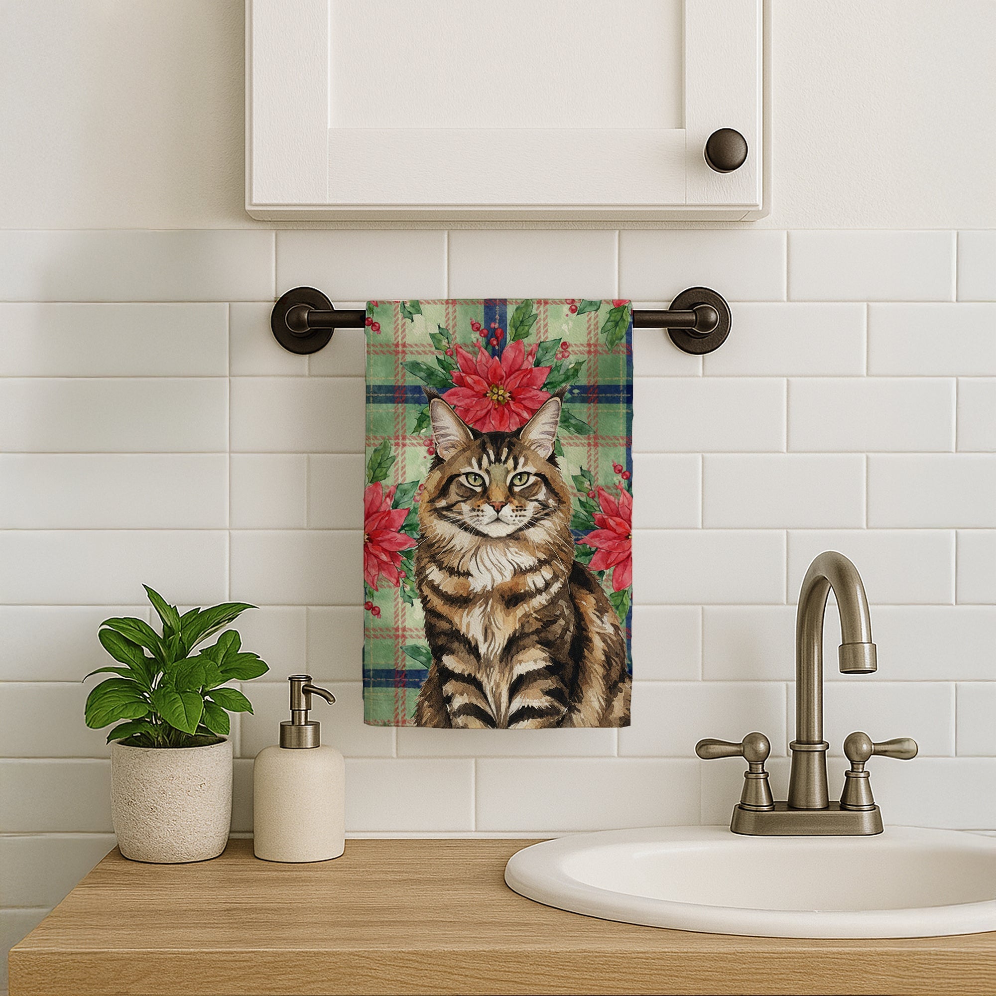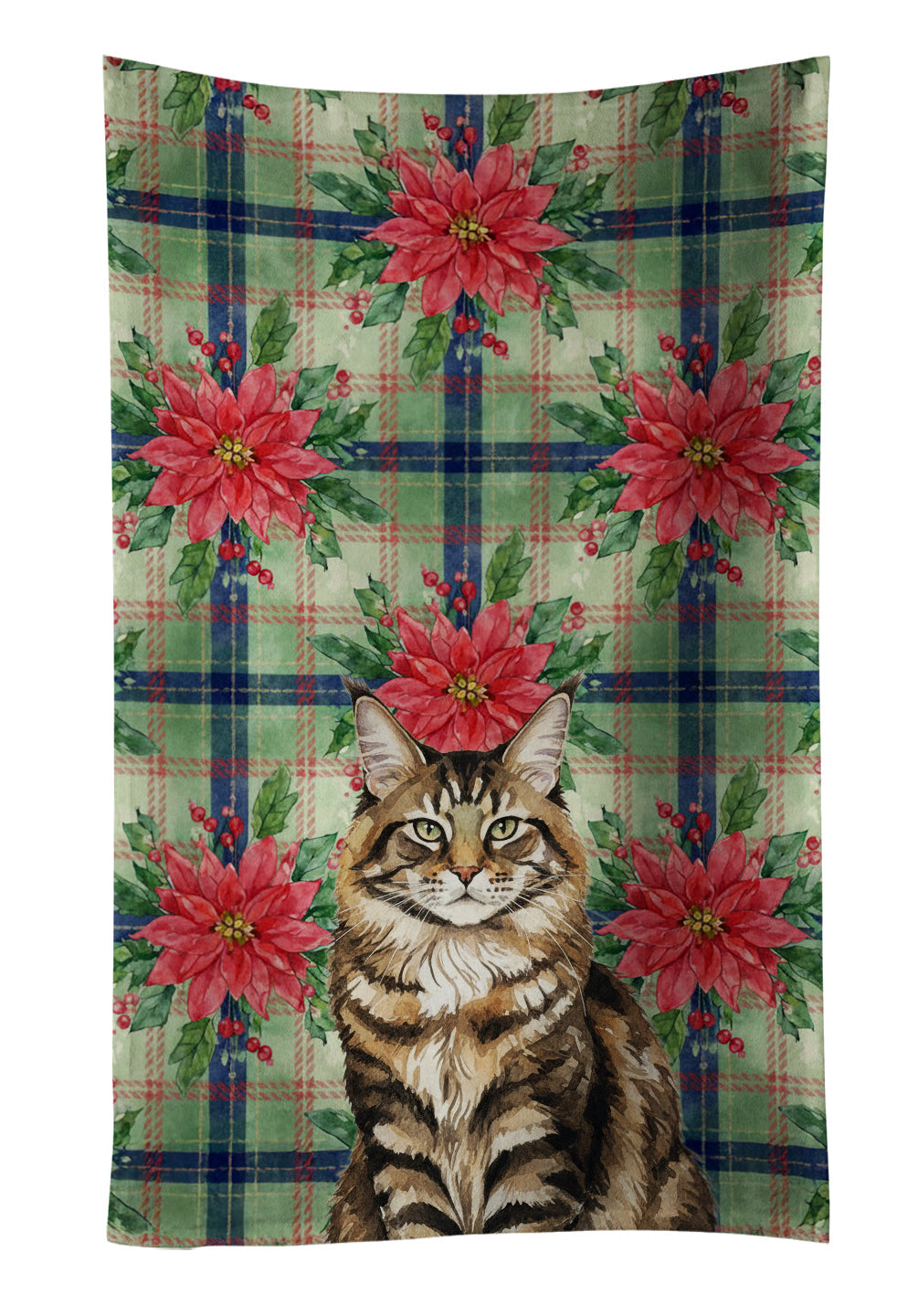 Kitchen Towel featuring breed specific MaineCoon Brown Tabby artwork. Celebrate Christmas with this Christmas Kitchen Towel. Bring cozy everyday charm to your sink or powder room with a plush velour towel featuring original watercolor artwork. The front is a soft, color-rich minky polyester that polishes glassware to a brilliant shine; the back is 100% white cotton terry loop for quick absorbency on hands, dishes, and counters. Artwork is dyed into the fibers for lasting color that won’t crack or peel. Finished edges keep the shape wash after wash. Size: 15" x 25". Machine wash; tumble dry low. Designed and printed in the USA.