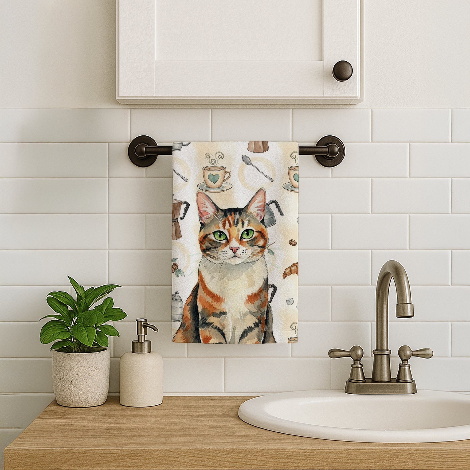 Kitchen Towel featuring breed specific Patched Tabby artwork. Celebrate Christmas with this Christmas Kitchen Towel. Bring cozy everyday charm to your sink or powder room with a plush velour towel featuring original watercolor artwork. The front is a soft, color-rich minky polyester that polishes glassware to a brilliant shine; the back is 100% white cotton terry loop for quick absorbency on hands, dishes, and counters. Artwork is dyed into the fibers for lasting color that won’t crack or peel. Finished edges keep the shape wash after wash. Size: 15" x 25". Machine wash; tumble dry low. Designed and printed in the USA.