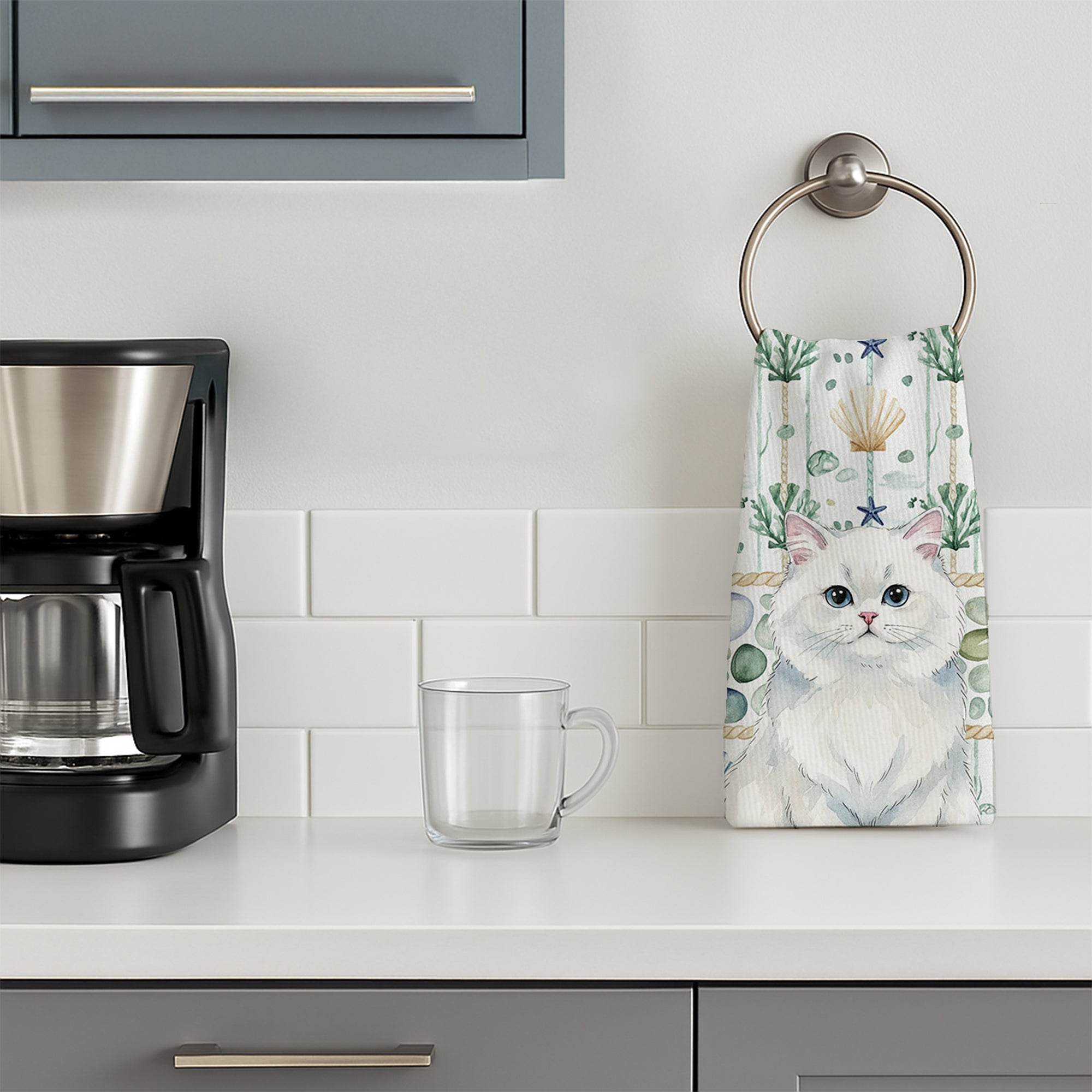 Kitchen Towel featuring breed specific Persian White artwork. Bring cozy everyday charm to your sink or powder room with a plush velour towel featuring original watercolor artwork. The front is a soft, color-rich minky polyester that polishes glassware to a brilliant shine; the back is 100% white cotton terry loop for quick absorbency on hands, dishes, and counters. Artwork is dyed into the fibers for lasting color that won’t crack or peel. Finished edges keep the shape wash after wash. Size: 15" x 25". Machine wash; tumble dry low. Designed and printed in the USA.