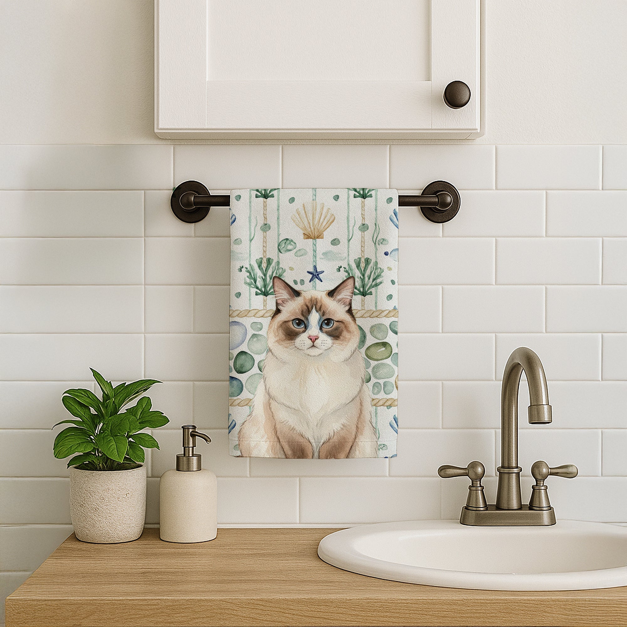 Kitchen Towel featuring breed specific Ragdoll Bicolor artwork. Bring cozy everyday charm to your sink or powder room with a plush velour towel featuring original watercolor artwork. The front is a soft, color-rich minky polyester that polishes glassware to a brilliant shine; the back is 100% white cotton terry loop for quick absorbency on hands, dishes, and counters. Artwork is dyed into the fibers for lasting color that won’t crack or peel. Finished edges keep the shape wash after wash. Size: 15" x 25". Machine wash; tumble dry low. Designed and printed in the USA.