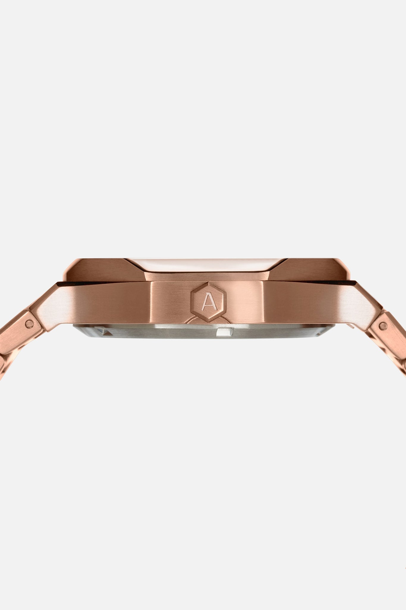 The Aura Date stands out as our most classic design, embodying sophistication and luxury with its timeless elegance. For a more relaxed style, it can easily be matched with an FKM strap. The Date 001: Rose/Black features a Seiko Japan NH35A self-winding movement, housed in a blend of brushed and polished steel, and highlights a stunning guilloché dial.