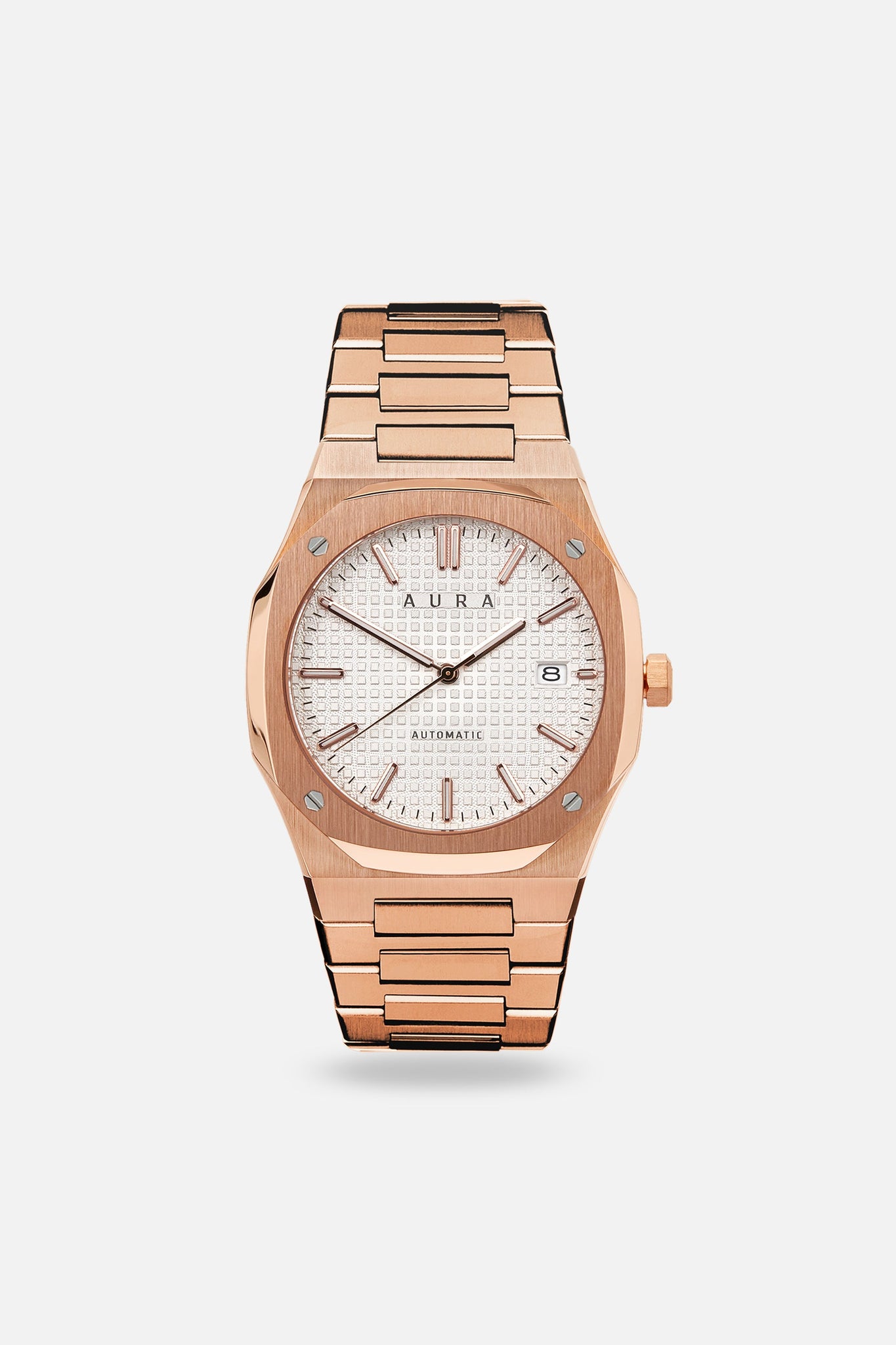 The Aura Date stands out as our most classic design, embodying sophistication and luxury with its timeless elegance. For a more relaxed style, it can easily be matched with an FKM strap. The Date 001: Rose/White features a Seiko Japan NH35A self-winding movement, housed in a blend of brushed and polished steel, and highlights a stunning guilloché dial.