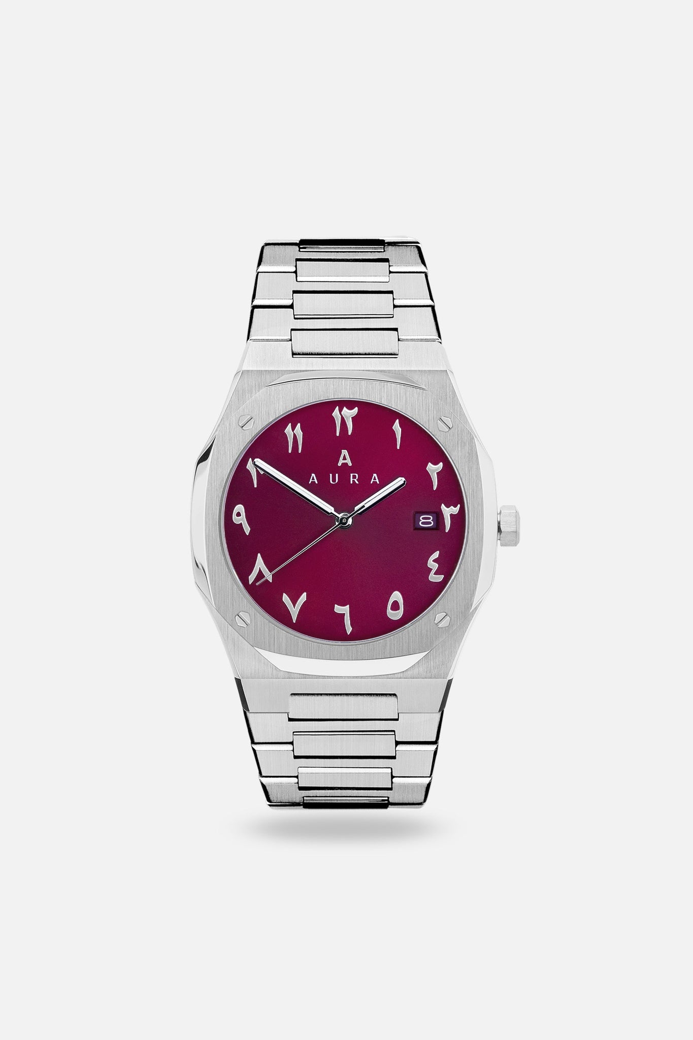 The Aura Date stands out as our most classic design, embodying sophistication and luxury with its timeless elegance. The Date 003: Steel/Maroon Arabic features a Seiko Japan NH35A self-winding movement, housed in a blend of brushed and polished steel, and highlights a stunning sunburst pattern maroon dial with Arabic markers.