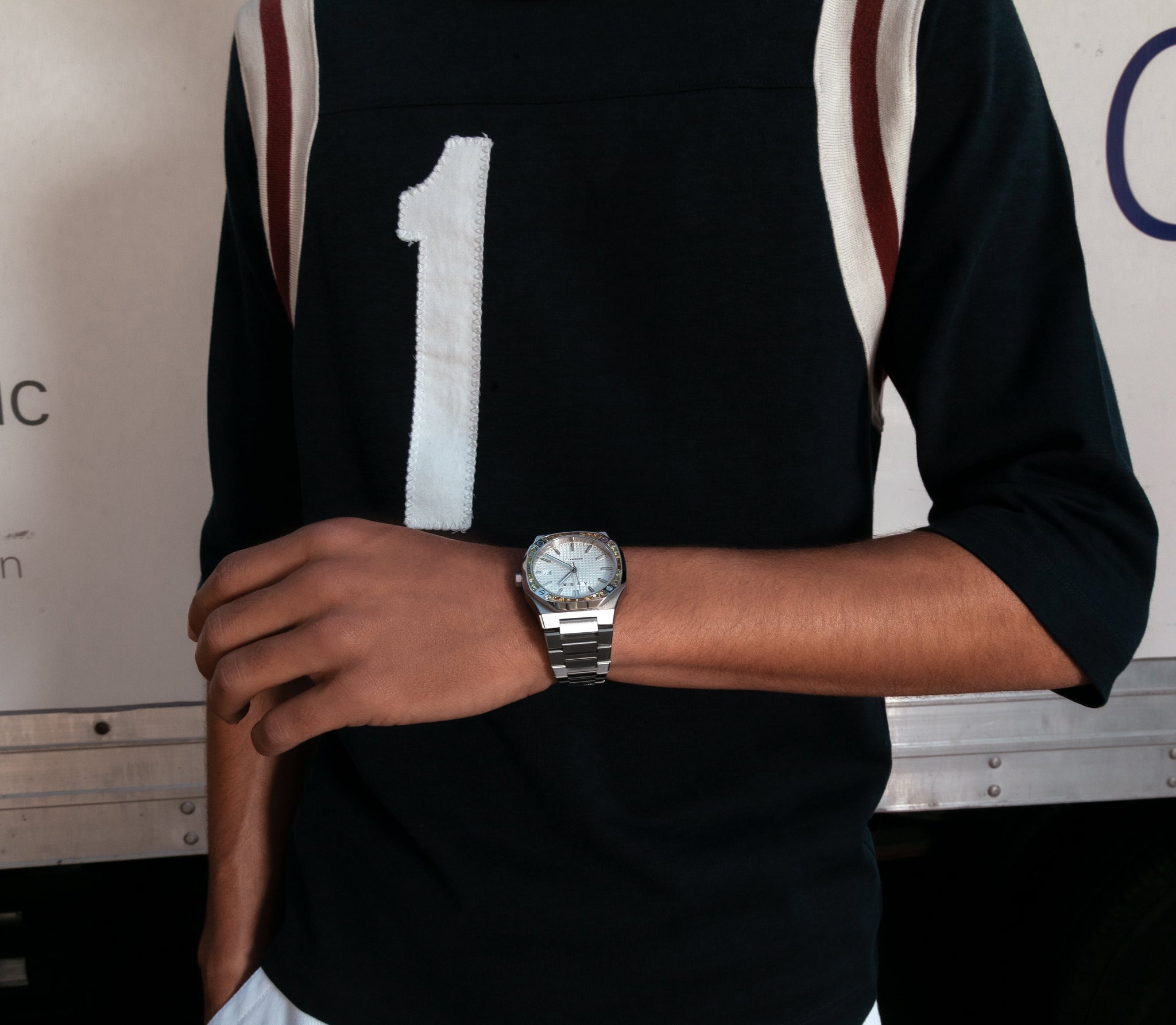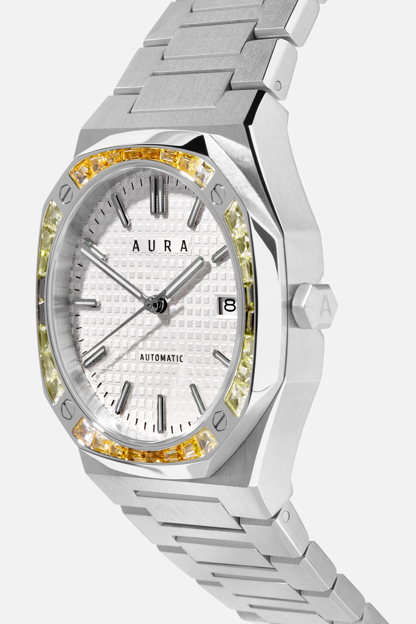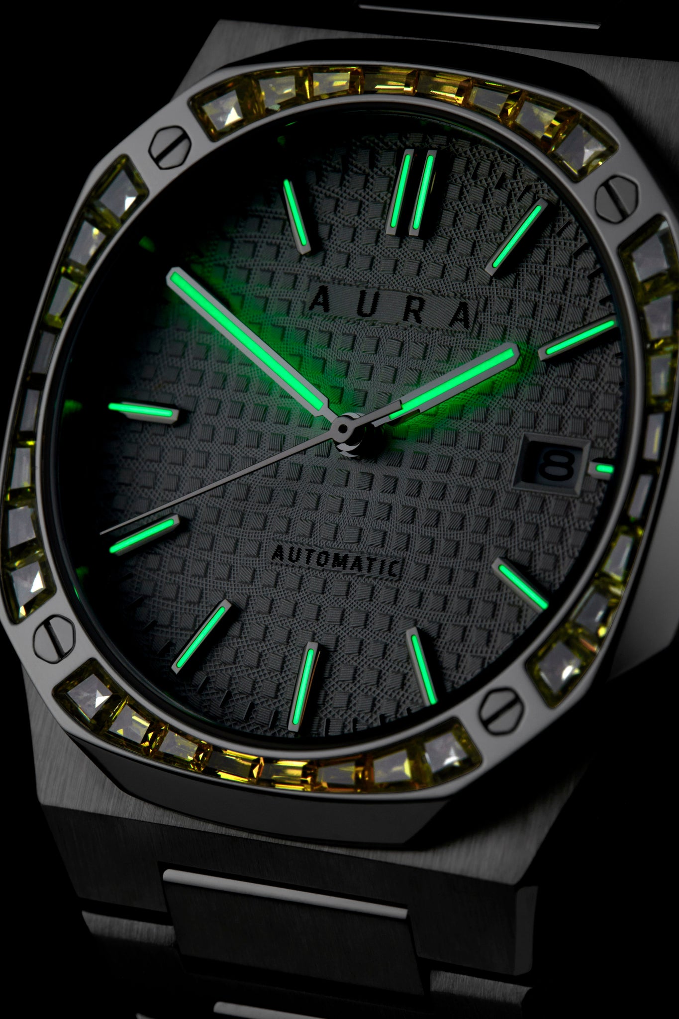 The Aura Date stands out as our most classic design, embodying sophistication and luxury with timeless appeal. The Date 003: Steel/Pineapple features a Seiko Japan NH35A self-winding movement, housed in a blend of brushed and polished steel, and highlights a stunning bezel adorned with multi-colored handset crystals complemented by a guilloché dial for elevated beauty and flair.